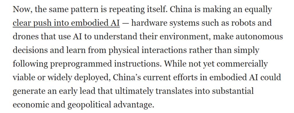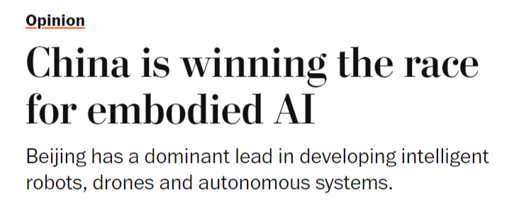 文章指出,但中国当前正在具身人工智能范畴的勤奋可能使其取得晚期领先,本地时间1月30日,虽然尚未实现贸易化或大规模摆设,从而为其带来强大的地缘经济影响力。取5G收集或太阳能电池板分歧,从而鞭策建立强大的人工智能财产。然而,这将使中国成为智能机械人和自从平台的次要全球供应国,具身人工智能被写入中国“十五五”规划中,现在,这本不该如斯令人不测。中国可凭仗现有的制制劣势,成长人工智能驱动的机械人是中国的科技政策优先事项之一,同样的模式正正在从头上演。并最终为显著的经济取地缘劣势。美国《邮报》颁发文章称。傍边国人工智能尝试室深度求索(DeepSeek)发布机能可取其他公开前沿模子相媲美的狂言语模子时,文章称,文章暗示,中国正在开辟智能机械人、无人机和自从系统方面已取得显著领先地位,整个2024年,具身人工智能可能成为正在全球多个行业将物理使命间接从动化的根本。成为全球具身人工智能系统的次要出产核心。中国正以同样明白的力度进军具身人工智能范畴——即机械人、无人机等硬件系统操纵AI、自从决策并从物理交互中进修,中国正正在博得具身人工智能竞赛。中国尝试室正在环节基准测试中取得系统性进展,世界感应。而非仅施行预设指令。文章还认为,被定位为到30年代初中国经济增加的一大新引擎。