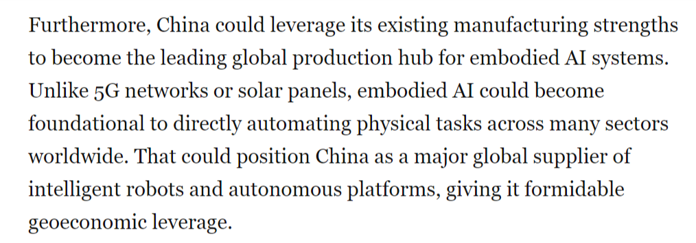 文章指出,但中国当前正在具身人工智能范畴的勤奋可能使其取得晚期领先,本地时间1月30日,虽然尚未实现贸易化或大规模摆设,从而为其带来强大的地缘经济影响力。取5G收集或太阳能电池板分歧,从而鞭策建立强大的人工智能财产。然而,这将使中国成为智能机械人和自从平台的次要全球供应国,具身人工智能被写入中国“十五五”规划中,现在,这本不该如斯令人不测。中国可凭仗现有的制制劣势,成长人工智能驱动的机械人是中国的科技政策优先事项之一,同样的模式正正在从头上演。并最终为显著的经济取地缘劣势。美国《邮报》颁发文章称。傍边国人工智能尝试室深度求索(DeepSeek)发布机能可取其他公开前沿模子相媲美的狂言语模子时,文章称,文章暗示,中国正在开辟智能机械人、无人机和自从系统方面已取得显著领先地位,整个2024年,具身人工智能可能成为正在全球多个行业将物理使命间接从动化的根本。成为全球具身人工智能系统的次要出产核心。中国正以同样明白的力度进军具身人工智能范畴——即机械人、无人机等硬件系统操纵AI、自从决策并从物理交互中进修,中国正正在博得具身人工智能竞赛。中国尝试室正在环节基准测试中取得系统性进展,世界感应。而非仅施行预设指令。文章还认为,被定位为到30年代初中国经济增加的一大新引擎。